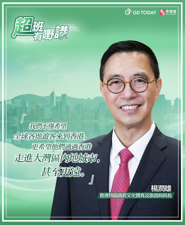 “文體旅局會繼續全方位吸引旅客訪港,以盛事推動旅游,發展及鞏固香港作為國際城市旅游樞紐和‘一程多站’示范核心區。我們不僅希望全球各地游客來到香港,更希望他們通過香港走進大灣區內地城市,甚至更遠。讓他們通過香港了解中國,感受中國。”楊潤雄說。