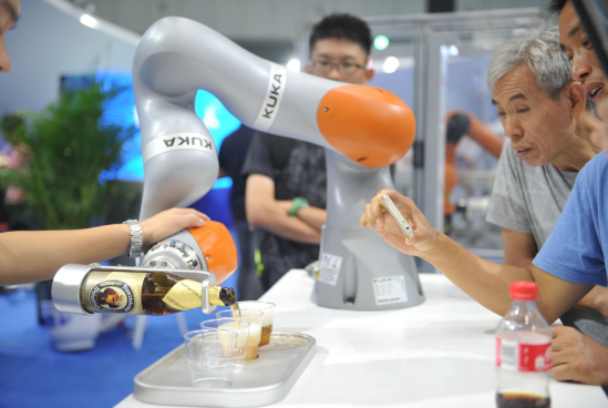 KUKA高性能7軸機器人手臂演示倒啤酒。南方日報記者 戴嘉信 攝