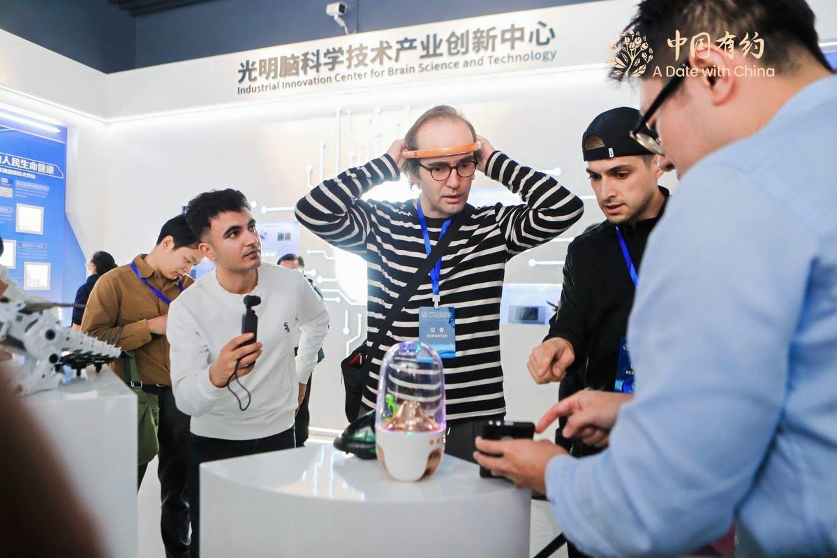 Participants on the 2025 "A date with China" international media tour visit the Industrial Innovation Center for Brain Science and Technology in Shenzhen, Guangdong province, on Nov 26, 2025. The three-day event starting Wednesday offers a firsthand look at the city's advancements in brain science infrastructure, the low-altitude economy, and applied artificial intelligence. [Photo/chinadaily.com.cn]