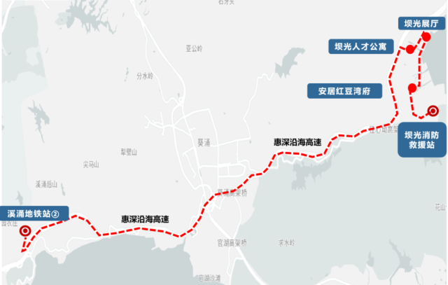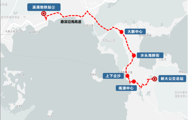 Key Stops: Baguang Exhibition Hall (壩光展廳), Baguang Talent Apartments (壩光人才公寓), Xichong Yancun (溪涌鹽村), Xichong Resort (溪涌度假村), Xichong Primary School (溪涌小學(xué)).