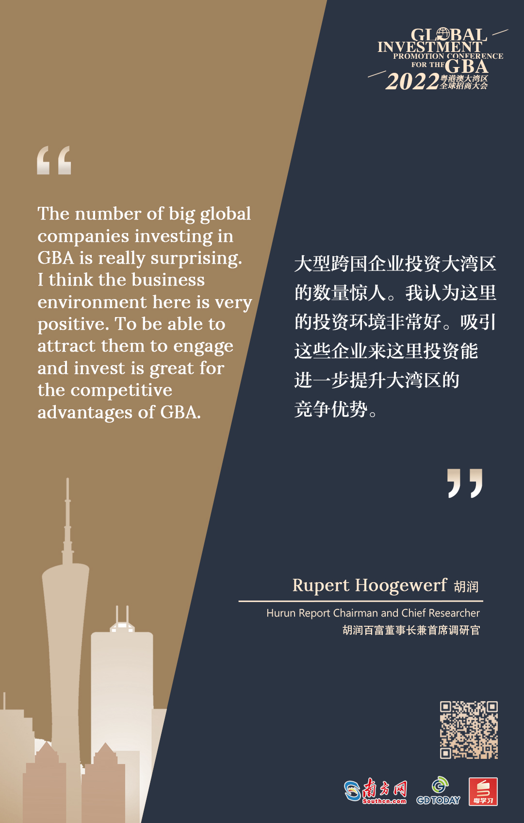 “The number of big global companies investing in Guangdong-Hong Kong-Macao Greater Bay Area (GBA) is really surprising. I think the business environment here is very positive,” said Rupert Hoogewerf, Hurun Report Chairman and Chief Researcher, when sharing with GDToday at the 2022 Global Investment Promotion Conference for the Guangdong-Hong Kong-Macao Greater Bay Area (GBA) on December 21.