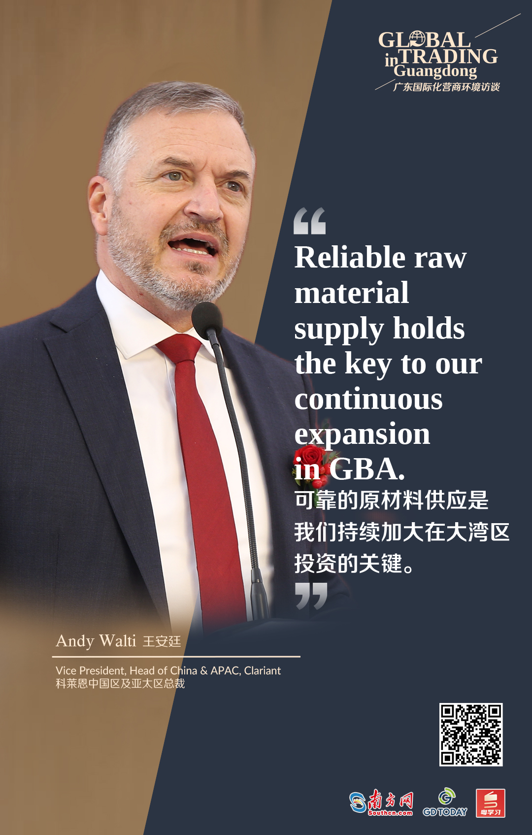 “Known as China’s economic powerhouse, Guangdong enjoys a sound industrial base, good business environment and advanced industrial clusters. The province or the whole Guangdong-Hong Kong-Macao Greater Bay Area (GBA) is home to many of Clariant’s customers. By continuously enlarging our presence here, we can be more responsive to the local market and providing more and more diversified solutions to our clients, said Andy Walti, Vice President, Head of China & APAC, Clariant, when sharing with GDToday before the 2023 two sessions of Guangdong.