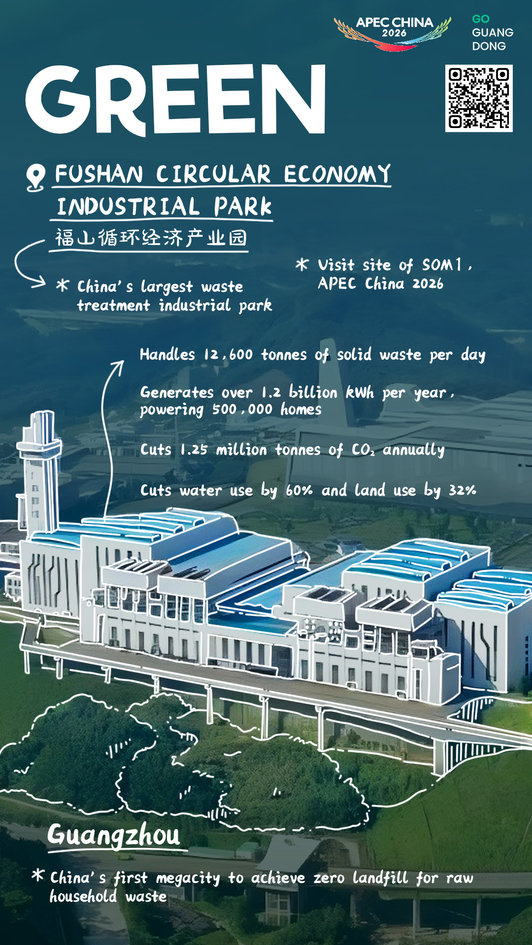 Guangzhou, a megacity with a population of 18 million, once faced a severe "garbage siege". To address this challenge, the city has taken a leading role by establishing seven Circular Economy Industrial Parks, making it the first in China to achieve zero landfill disposal of raw household waste. The city's circular economy industry parks are equipped with a daily waste-to-energy incineration capacity of 30,000 metric tons, along with a biological treatment capacity of 6,100 metric tons per day.