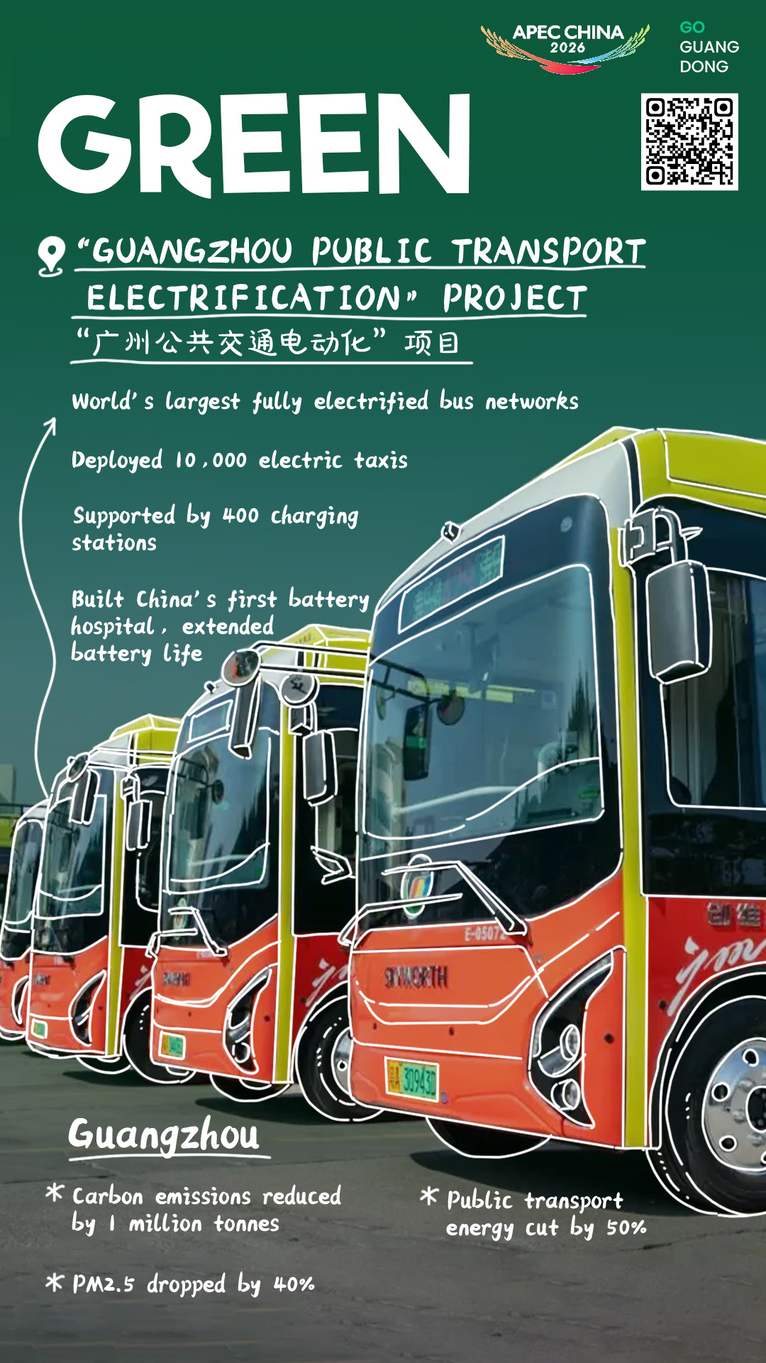 Starting in 2017, with support from the municipal government, Guangzhou Public Transport Group launched the "Guangzhou Public Transport Electrification" project. Through this initiative, it deployed 12,000 electric buses and nearly 10,000 electric taxis, supported by 400 charging stations, creating one of the world's largest fully electrified bus networks.