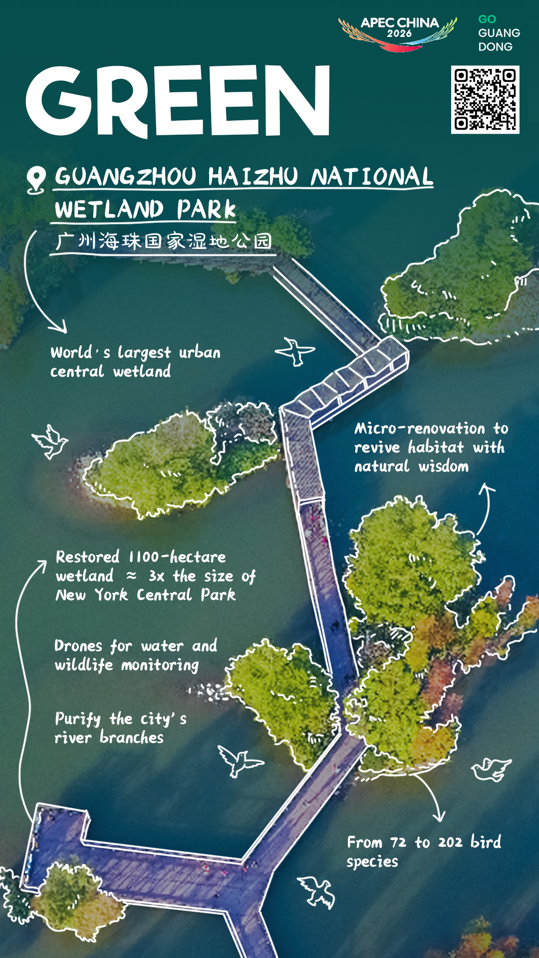 Recognized as China's first urban wetland on the IUCN Green List and listed as an Internationally Important Wetland in 2023, Haizhu Wetland demonstrates how cities can harmonize development with ecology. Its success underscores Guangzhou's commitment to sustainable urban governance, blending scientific innovation with public engagement to create a "green lung" for millions.