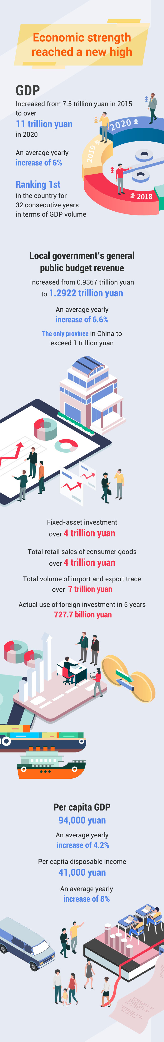 The province's GDP exceeded 11 trillion yuan in 2020 with an annual average growth rate of 6%, which has ranked 1st in the nation for 32 consecutive years.