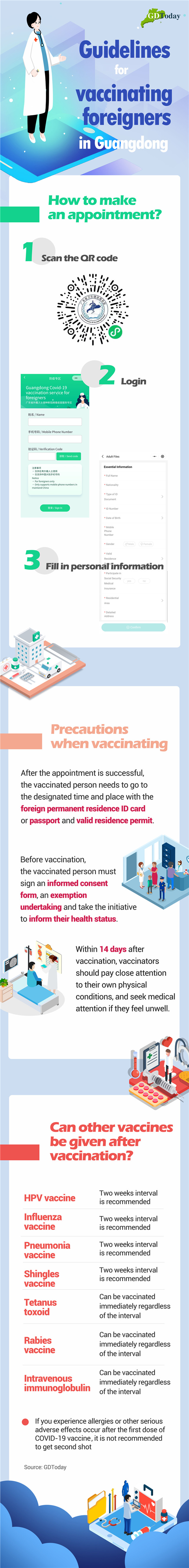 China’s domestic inactivated SARS-CoV-2 vaccines will be used, and two doses are required. Foreign nationals who have joined Guangdong’s social medical insurance scheme may take vaccine free of charge. If you have not, you’ll need to pay a charge of 100 RMB per dose.