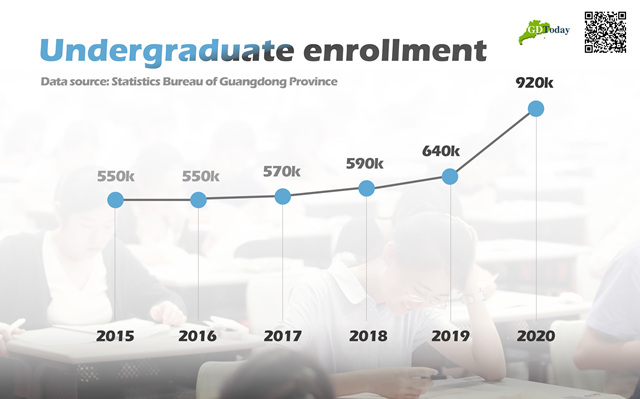 Guangdong's Statistical Bulletin of National Economy and Social Development 2020 shows that the amount of undergraduate enrollment has increased from 550 thousand in 2015 to 920 thousand in 2020.