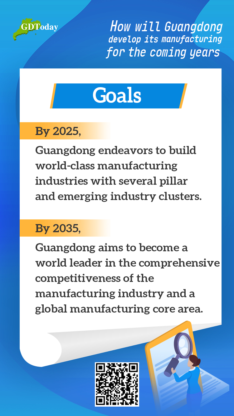 The overall goals give visions of Guangdong manufacturing industries in 2025 and 2035, where Guangdong will manage to be one of the world-class bases as well as manufacturing core areas. The specific goals, which are mainly indicator-based, include manufacturing's proportion in provincial GDP, R&D investment ratio for enterprises and product qualified rate.