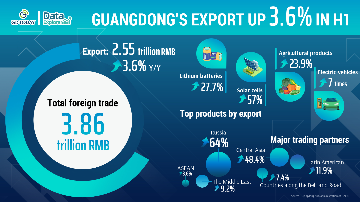 Guangdong's exports reached a record high of more than 2.55 trillion RMB in the first half of the year, increasing by 3.6 percent year on year, data from Guangdong Sub-administration of the General Administration of Customs of the People's Republic of China (GACC) showed.