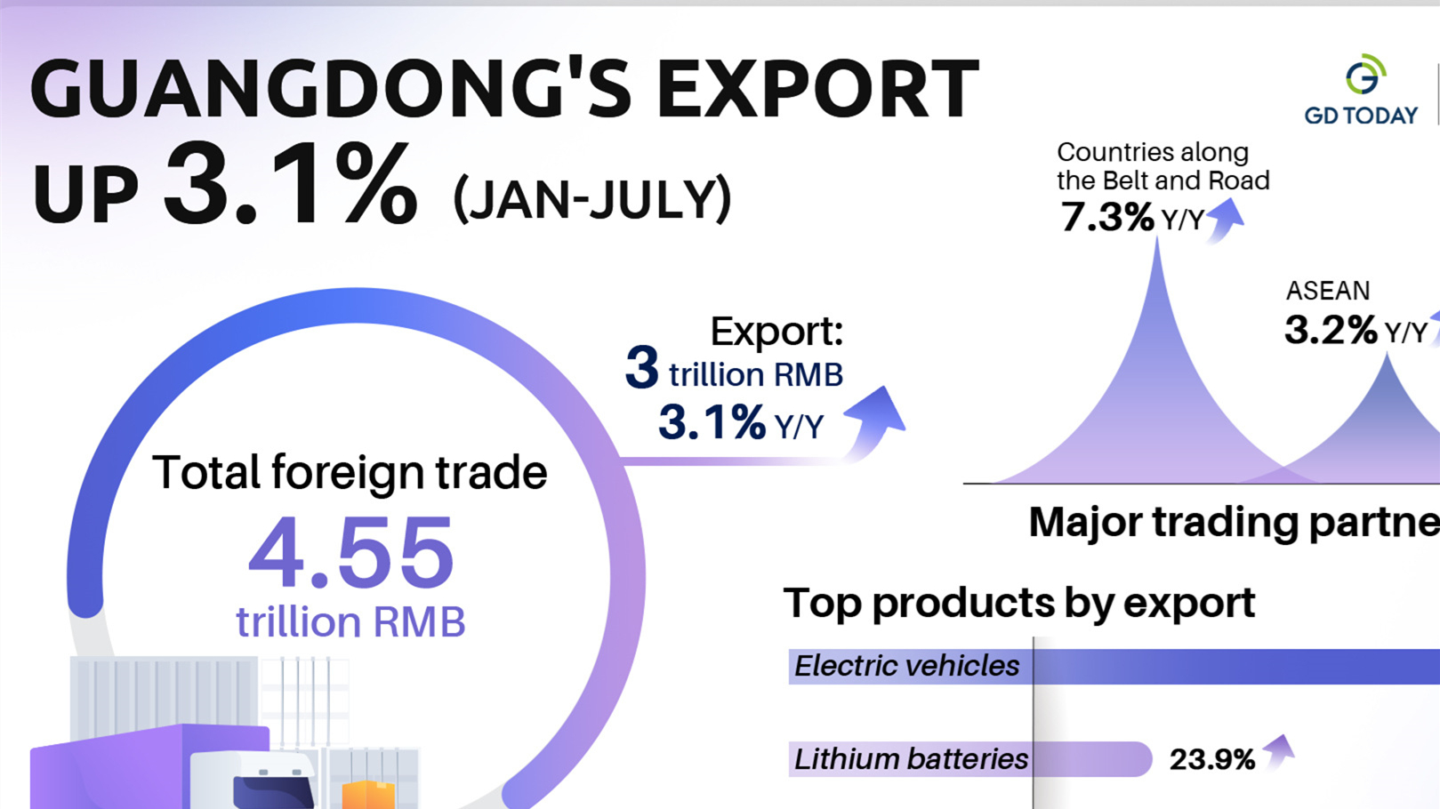 Guangdong's import and export volume reached 4.55 trillion RMB in the seven months ending July this year, representing 19.3 percent of the country's total, data from Guangdong Sub-administration of the General Administration of Customs of the People's Republic of China (GACC) showed.