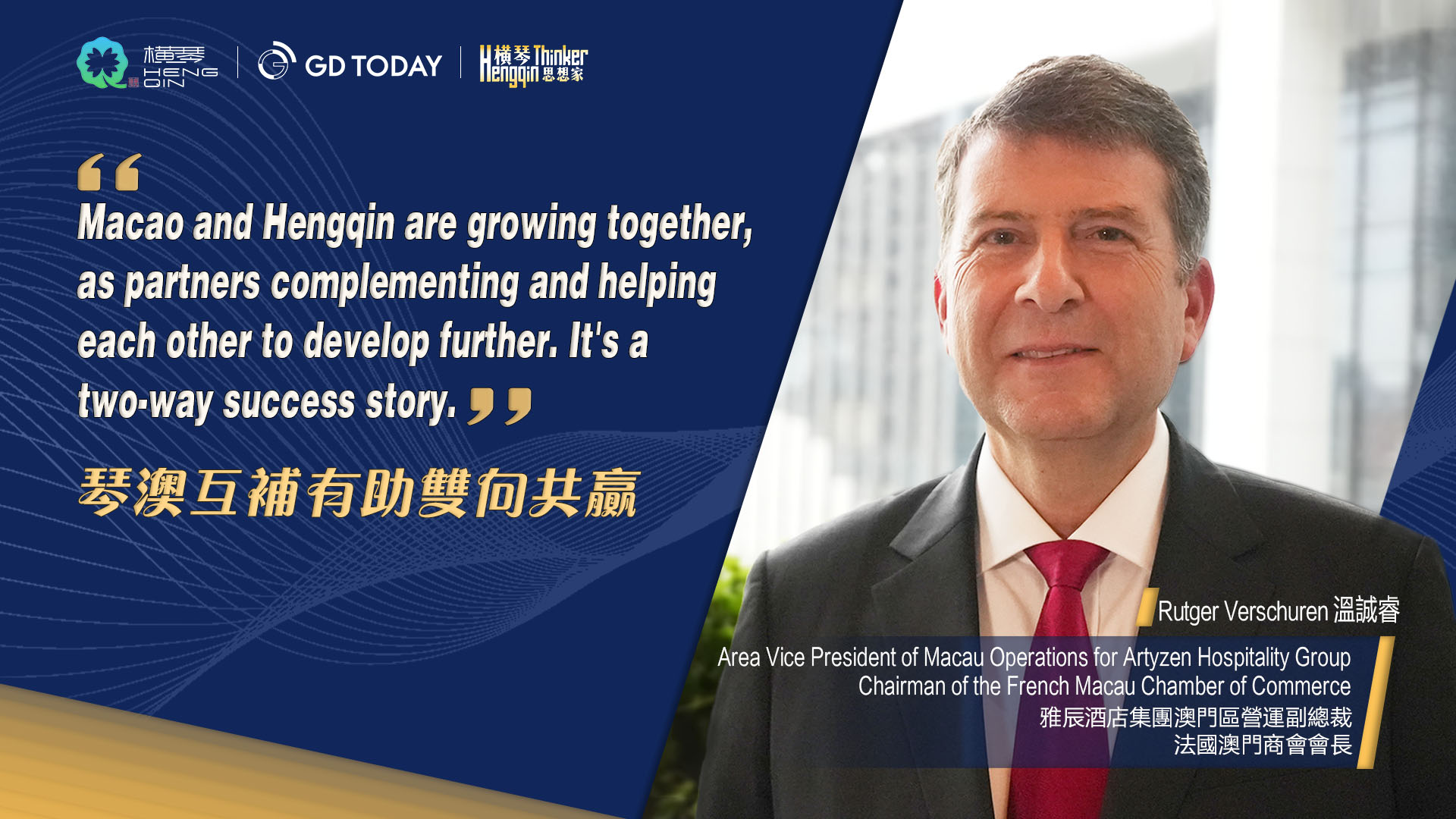 As we celebrate the third anniversary of the Guangdong-Macao In-Depth Cooperation Zone (shortly referred to as the "Cooperation Zone"), GDToday is launching a series of interviews titled "Thinker in Hengqin". This series will gather the thoughts of distinguished individuals from the fields of government, business, and academia to review Hengqin's significant progress and offer a comprehensive view of its development journey. Through these dialogues, we aim to highlight Hengqin's role in promoting industrial collaboration between Guangdong and Macao, strengthening ties with Portuguese-speaking countries, and reflecting the importance and potential of China's modernization efforts.