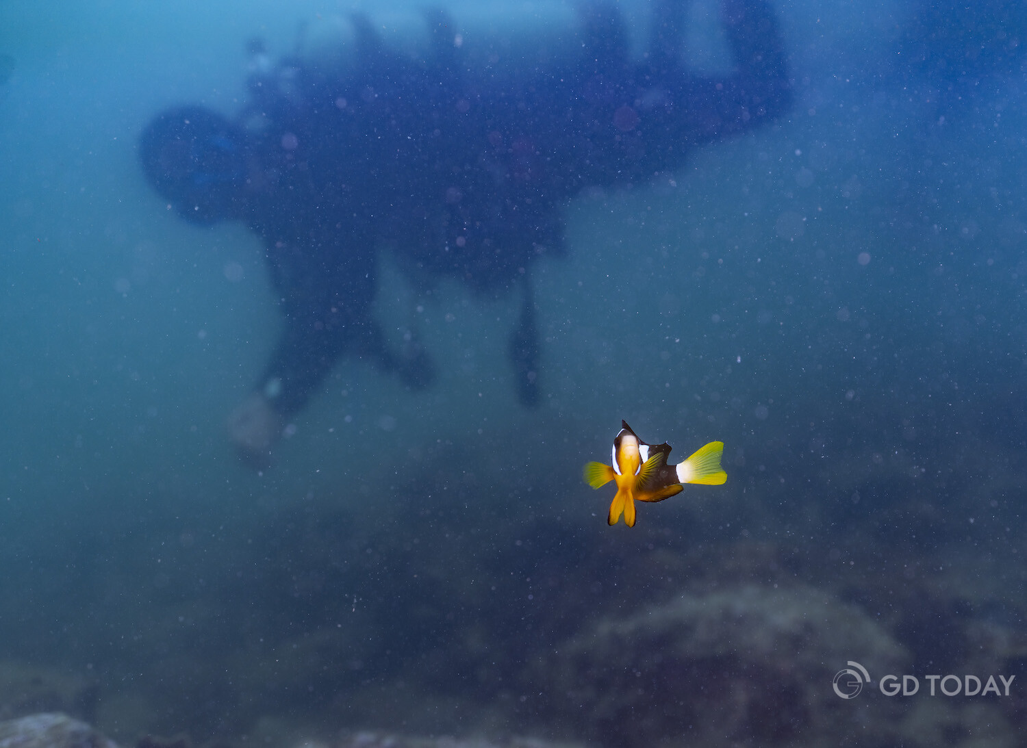 In the waters around Wailingding Island in Zhuhai, a diver swims alongside Clark's anemonefish.