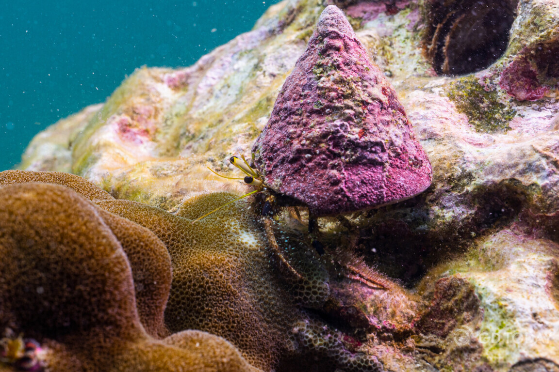 A hairy red hermit crab inside a pyram top shell in the waters around Wailingding Island in Zhuhai.