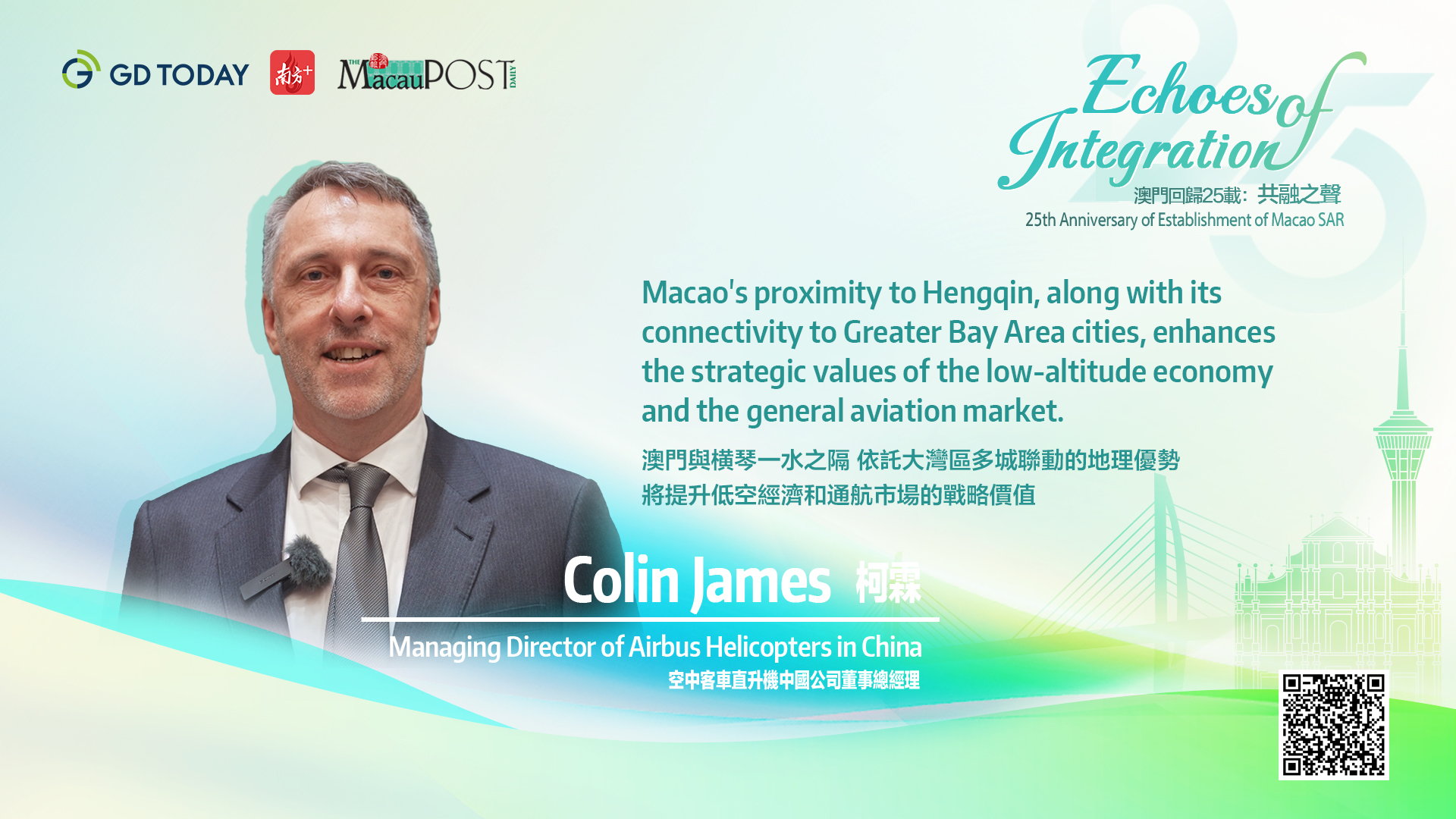 "Macao's proximity to the Guangdong-Macao In-depth Cooperation Zone in Hengqin, along with its connectivity to Greater Bay Area cities (the new headquarters of Airbus Helicopters China), can enhance the strategic values of the low-altitude economy and the general aviation market," said Colin James, Managing Director of Airbus Helicopters China, in a recent interview with GDToday.