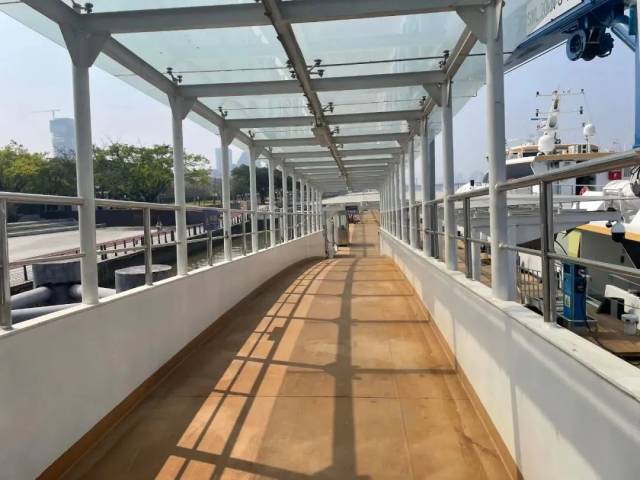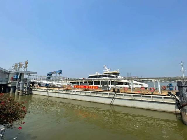 碼頭上停靠著兩艘客船,透過通關(guān)閘口的落地玻璃即可看到廣交會(huì)展館……