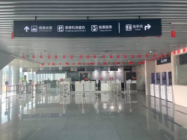 走進(jìn)聯(lián)檢樓大廳可以看到,通過首層安檢機(jī)器,即可搭乘電梯前往二層出境大廳前往港澳,在這一層,旅客可以在整潔寬敞的出發(fā)大廳窗口購買船票,也可以辦理自助取票和香港機(jī)場值機(jī)業(yè)務(wù),辦理好值機(jī)業(yè)務(wù)后通過出境查驗(yàn)通道就可以到達(dá)登船口。