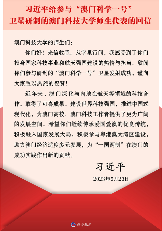 國(guó)家主席習(xí)近平5月23日給參與“澳門(mén)科學(xué)一號(hào)”衛(wèi)星研制的澳門(mén)科技大學(xué)師生代表回信,對(duì)他們予以親切勉勵(lì)。
