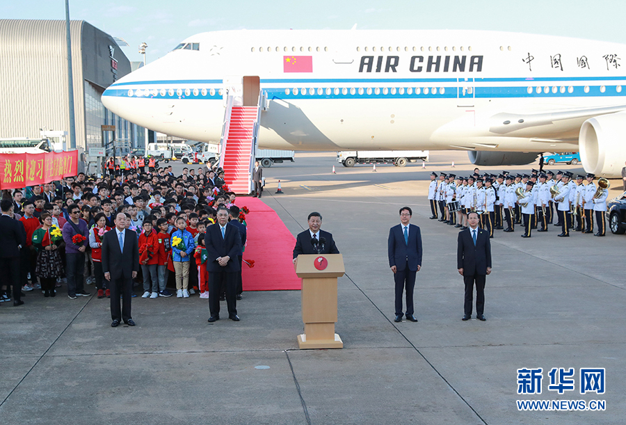 12月18日,中共中央總書記、國家主席、中央軍委主席習近平乘專機抵達澳門,出席將于20日舉行的慶祝澳門回歸祖國20周年大會暨澳門特別行政區第五屆政府就職典禮并視察澳門。這是習近平在機場發表重要講話。 新華社記者 謝環馳 攝