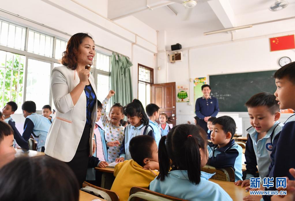 (2019年2月20日,米雪梅在中山市沙溪鎮虎遜小學調研時與小學生交流。新華社記者 劉大偉 攝)