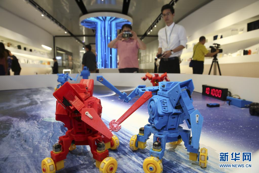 (4月19日,在廣東工業設計城創新科技館,工作人員在展示機器人“速斗無人區”。新華社記者 殷剛 攝)