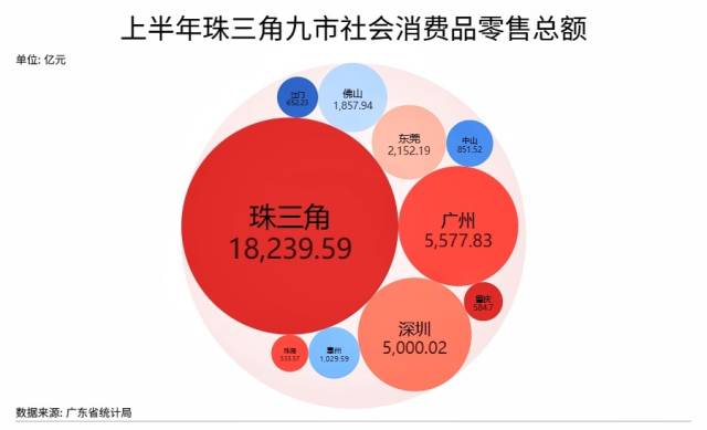 作為全國消費“風向標”,今年上半年,珠三角九市的社會消費品零售(下稱“社消零”)總額首次超過了1.8萬億元,為全省社消零總額貢獻七成,與去年上半年社消零總額約1.7萬億元相比,多出整整一個惠州的消費總量。