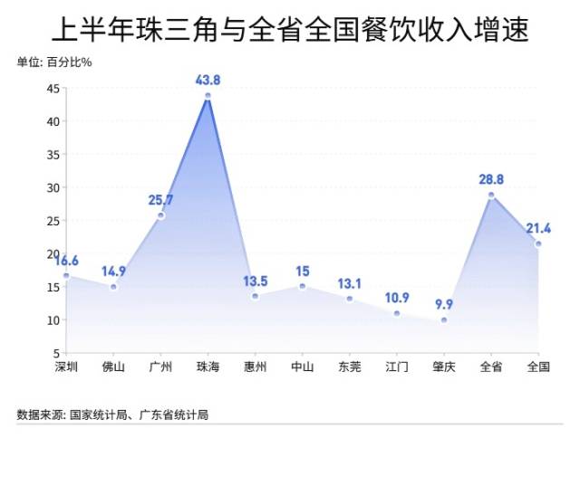 上半年,接觸型消費在珠三角強勁復蘇,珠海、中山、佛山、東莞、惠州、江門、肇慶餐飲收入增長分別為43.8%、15.0%、14.9%、13.1%、13.5%、10.9%、9.9%。8座城市實現餐飲收入兩位數增長。