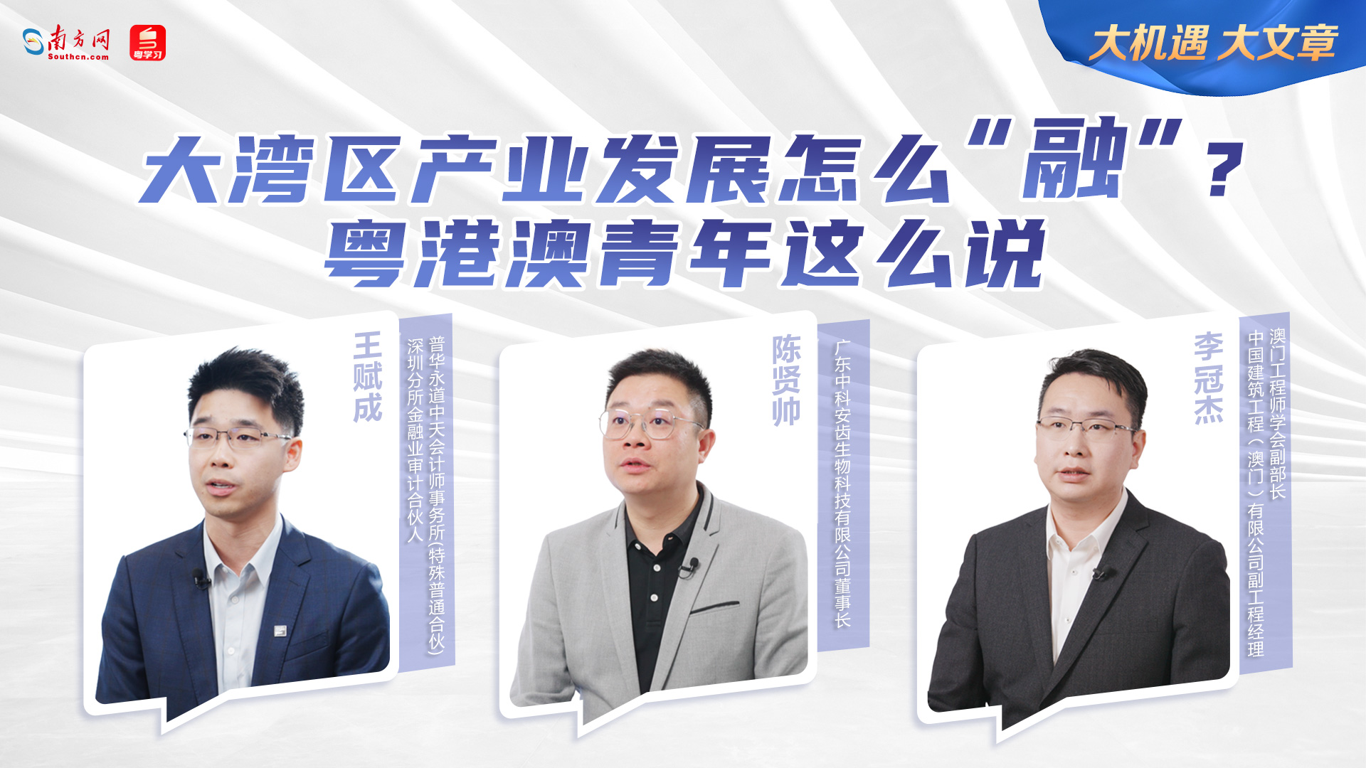 今年是《粵港澳大灣區發展規劃綱要》(簡稱《規劃綱要》)印發五周年。過去五年,有一批像陳賢帥這樣的年輕人,奮斗在科技、金融、建筑等不同行業一線,乘著大灣區建設的東風快速成長,見證粵港澳產業融合發展的強大動能。